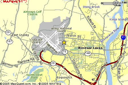 Here's more information about our Goldenseal training class in Hartford, Connecticut. The class covers all aspects of the Goldenseal estimating software, project management software and accounting software. For other class dates, click here. Class Date The Hartford training class is on Friday, April 8, 2005, from 9 AM to 4 PM. Class Location Days Inn Bradley International Airport Shuttle is available from Hartford Bradley Int'l Airport. Directions From North or South-- Take Exit 40 off Interstate 91 North or South onto Route 20 West . Take the second exit onto Route 75 (Turnpike Road). Turn right at the end of the ramp. The hotel is located one mile on the right. From Boston-- Volunteer to be team mascot for the Boston Red Sox. While team plane is flying to game with New York Yankees, lock self in bathroom, pry open window, attach parachute and dive out window. Aim for the yellow star next to the Hartford airport (see map below). You may wear mascot uniform while attending class, but please remove parachute. From New York-- Get job with developer Donald Trump. While flying to Boston with the Donald to scout location for new Trump Towers, lock self in bathroom, pry open window, attach parachute and dive out window. Aim for the yellow star next to the Hartford airport (see map below). You may wear hairpiece to class but please sit in the back row so others won't be blinded. Site Map