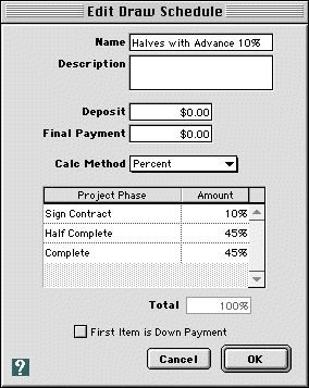 | How do I enter deposits or down payments at the start of a project? In Goldenseal project billing software, the way you'll handle payments at the start of a project depends on the billing type. There are three basic types of project billing, and project down payments work slightly differently for each. HINT-- For small, quick projects that get a single payment, you can also use a Sales transaction. When you receive funds, you can print a payment receipt diretly fro the Sale. Draw Schedules For a Draw Schedule project, you can either type in a separate down payment, or set up the down payment as one of the steps in the Draw Schedule.