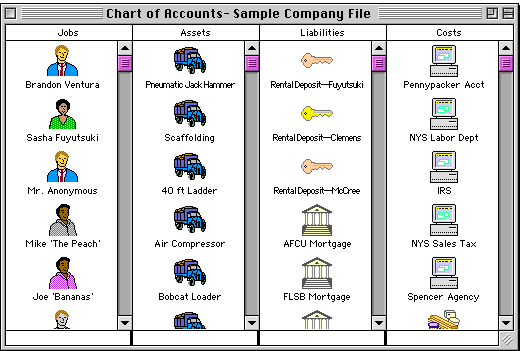 Expense Accounts & Revenue Accounts To track expenses by job, enter the job account into each expense record— you do not need to set up any accounts except for the Project account which covers the work you are doing. To track expenses by type, enter a cost category into the Category field in each expense record. To change cost categories, choose Category Setup from the Costs menu, and choose Cost Categories or Category Systems from the submenu. You do not need to set up any accounts to track expenses or revenue— Goldenseal handles that automatically with the job cost categories. Accounts Payable & Accounts Receivable Goldenseal automatically tracks Accounts Payable, Accounts Receivable, Unpaid Taxes and many other expense categories. You do not need to add them to the Chart of Accounts, since Goldenseal automatically includes them (and posts transactions to them). The best way to view Accounts Payable and Unpaid Taxes is with the Pay Bills command. Click here for more about Goldenseal Accounts Payable software, as compared to Quickbooks. The best way to view Acounts Receivable is with the Billing commands. Click here for more about Goldenseal Accounts Receivable software, as compared to Quickbooks. To view 'intangible' accounts, choose Utility Accounts from the Accounts menu. However you do not need to look at or change these accounts, because Goldenseal will keep track of them automatically. Chart of Accounts Window The Goldenseal chart of accounts window shows all of your "tangible" accounts. It uses a graphic approach so it is easier to find your records. You can change the icon size and sorting order for each column. You can also start transactions by dragging from one account to another.