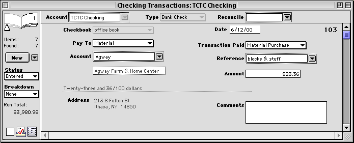 You can also enter checks individually, and match it to the transaction that it covers, or pay money "on account" if there isn't a specific item due. Instant PaymentsWhen you pay for a purchase by check, cash or credit card, Goldenseal creates an "instant payment" for the item when you enter the expense transaction. That way you won't need to enter two transactions for the purchase. Check PrintingGoldenseal prints checks on any pre-printed check forms. We have blanks that support the most common layouts, and you can easily use the Custom Layouts command to change the forms to fit anything else. Goldenseal also prints paychecks. It itemizes wages and deductions and prints them on they pay stub. Goldenseal allows paycheck printing on a variety of check blanks. You can customize the pay check printing layouts, if you'd like to see something different. If you print large numbers of checks, you may want to use Goldenseal to print your own MICR checks with routing info on the bottom of the checks. For smaller quantlties you can use economical pre-printed checks. ReportsTo see a "register view" of your checking account, choose Banking from the Reports menu, and choose Checking Transactions from the submenu. Other BankingThe Goldenseal checkwriting software also includes transactions for cash, credit cards, savings, escrow accounts and loan accounts. They work exactly the same as checking transactions. For more about bank transactions in the Getting Started