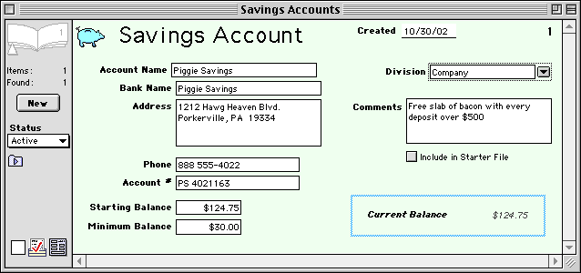 Rental Units Each rental property can contain one or more rental units. Enter them into the rental unit table. For each unit, type in a short name, choose rental payment terms, and enter the rent that you charge. For more about rental units in the Reference manual, click here. NOTE: To enter rental payment terms, choose Payment Terms from the Options menu, then choose Rentals from the submenu. Using Real Estate Accounts When you enter expenses for a property, enter a Real Estate account into the Job field. Enter Leases for tenants who rent, and enter Rental Transactions for the rent that they owe. To create rental bills, choose Billing from the Bank menu, and choose Rentals from the submenu. To create a new Savings account, follow these steps:
