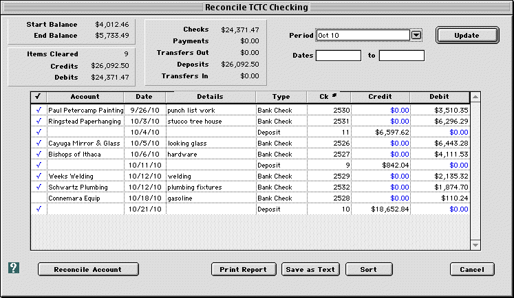 HINT: To view the 'on account' balance for an account, open the browser window for that account and check the calculated values at the bottom right corner of the window. If the deposit uses a Payment breakdown, Goldenseal applies the deposit to the listed items. NOTE: For more about Deposits, see Lesson 44. Transfers In and Out If you enter a Transfer In or a Transfer Out for another bank account, Goldenseal considers the transaction to be a simple transfer between accounts. The two account balances are changed, but no other posting is done. If a Transfer In is for Interest Received or Other Credit, you can assign the income to any job account. Usually you will add it to an Overhead account, but you can also assign it to another type of account. Goldenseal posts the job costs, but doesn't post to any accounts. If a Transfer Out is for Interest Paid or Other Charge, you can assign the cost to any job account. Usually you will add it to an Overhead account, but you can also assign it to another type of account. Goldenseal posts the job costs, but doesn't post to any accounts. Goldenseal makes it easy to reconcile your computer records against bank statements, so you'll catch any mistakes that you or the bank made. Creating Reconcile Periods To enter reconcile periods that you can use to mark off bank transactions that have cleared, follow these steps: