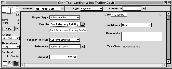 Follow the same steps to handle other transfers such as an ATM withdrawal that you put into a Cash account, a transfer from savings to checking, or an automatic bank payment to a loan account. NOTE: If you write a check to transfer funds, enter a Check transaction instead of a transfer. When you enter a Transfer In, Goldenseal automatically creates a Transfer Out in the other bank account. To see the offsetting transaction, double-click in the Transaction Ref field at lower right. NOTE: If you are viewing transactions for just one account and you've made a transfer to another account of the same type, Goldenseal won't be able to display it. If you need to make a payment to someone and don't want to set up an account for them, follow these steps: