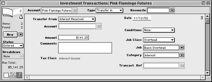 When you pay interest on a loan or credit card account, enter it exactly the same as a service charge, but enter Interest Paid into the Transfer To popup field. Use a Transfer In to enter interest that you earn on any type of bank account. To enter interest earned from an Investment account, follow these steps: