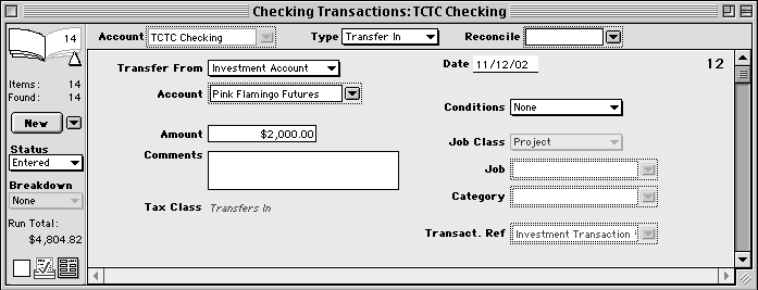When you receive a miscellaneous non-interest credit directly from a bank account, enter it exactly the same as earned interest, but enter Other Credit into the Transfer From popup field. Use bank transfers to shift money from one bank account to another. For example, to transfer funds from an investment account to a checking account, follow these steps: