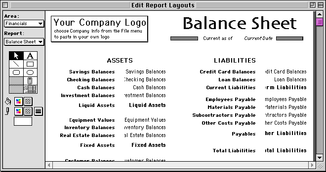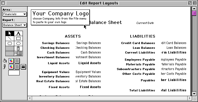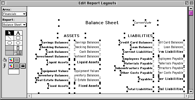 HINT: To save time, use the Select All command to select the fields in a layout that is similar to the one you are creating. Choose Copy from the Edit menu, switch to the new layout, and then choose Paste from the Edit menu. To select an item in a layout, click on it. A selected item gets small square 'selection handles' at each corner. To select multiple items, hold down the Shift key as you click on each field, or drag a 'selection rectangle' around a block of fields. To select all items in a layout, choose Select All from the Edit menu. To add some space at the top of the balance sheet report, follow these steps: