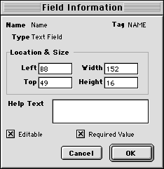 To see information about any field in a layout, select it, then choose Field Properties from the Format menu. HINT: You can also double-click on a field to see its properties. To change the field's location or size, type in new numbers. HINT: You can be more precise about setting a field's size or location when you type in a number instead of dragging it with the mouse. To change the 'help text' that appears on the right side of the window when the mouse is in this field, type in different text. To set the field so it can't be changed, turn off the Editable checkbox. You might want to do that for the record number field. To set the field so it cannot be blank, turn on the Required Value checkbox.