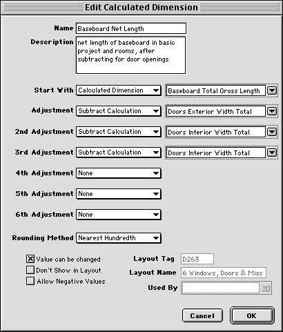 When you add locations to an estimate, Goldenseal will calculate the value of each calculated location. HINT: If you start with a Starter File), you'll already have a set of dimensions, and you may not need to make many changes to them to match your type of business. If there is no Starter File for your type of business, contact Turtle Creek-- we offer free customizing help. Calculated dimensions calculate a value from any type of dimensions, or from other calculated dimensions. HINT: The Sample Company file includes several hundred Calculated Dimensions that convert simple project measurements into construction quantities like baseboard length. To enter calculated dimensions, follow these steps:
