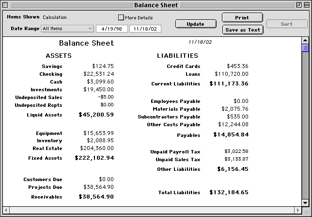 The Goldenseal business management software includes a variety of reports that show you valuable information about your business. Reports are a useful management tool. Lesson 20 explains how to use the basic Reports window showing a wide range of estimating and basic business reports. This lesson covers some additional reports used for accounting and finances. The balance sheet shows you a compact listing of your assets, liabilities and net worth. It's a good way to see how solvent your business is. To see a balance sheet report, choose Financials from the Reports menu, then choose Balance Sheet from the submenu.