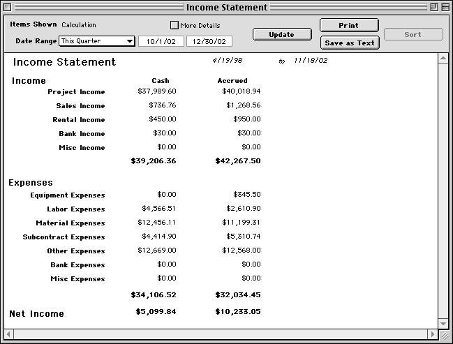 The Income Statement gets all income values within the date range that is specified in the Date Range field. To see income and expenses for a different period, change the Date Range popup field (see Lesson 20). The Cash figures are based on bank transactions, and the Accrued transactions are based on expense transactions and income transactions (sales, project billing and rental transactions). To see a list of material purchases, follow these steps: