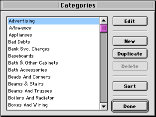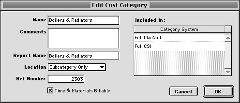 NOTE: If you turn off the Use Category Systems checkbox, Goldenseal will not use category systems. In that case you can always use any cost category, and subcategories will never be used. If you have a construction or service business, you'll probably need at least two different category systems-- one for the work you do, and one for your general overhead expenses. For other types of business, one category system may be sufficient. Whether you use subcategories is a matter of personal preference (they take more data entry time, but give you more useful cost information). HINT: Some people set up two category systems-- one that includes subcategories and one that doesn't. Then you can use different levels of job cost detail for different projects. If you aren't sure which categories to use, start with a simple system that includes whatever seems obvious at first. You can always add new categories as you think of them later on. HINT: The Starter Files include pre-set category systems for several business types. You may be able to use one of them as a starting point, when you set up a cost category system for your company. Cost Categories You'll use cost categories in most parts of Goldenseal-- they are a central part of our job cost accounting software. There is a category field in all expense transactions (see Lessons 33 and 35). If you use a category or item breakdown, each breakdown item has a category (see Lesson 34). Allowances, bids, change orders and estimates are also itemized by category (see Lessons 3 and 6), as are direct bank purchases and sales that use a category or item breakdown. Cost Items and Assemblies also include a cost category (see Lessons 13 and 14). When you use them in an Item breakdown, you won't have to look through hundreds or thousands of items-- you'll only see the items that belong to one category. The Sample Company file already includes a set of cost categories for a construction company. To add a new cost category, follow these steps: