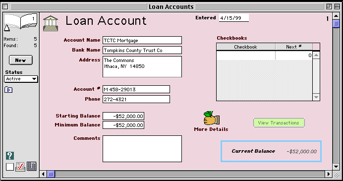 Using Escrow Accounts To transfer money in or out of an escrow account, choose Escrow Transactions from the Bank menu. Loan Accounts Use Loan accounts for any loans that aren't credit cards. To create a new Loan account, follow these steps: