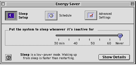 Setting Sleep Mode on the Server The server machine may go into ‘sleep’ mode to conserve energy. When a client needs something from the server, there will be a delay while the server machine wakes from sleep mode. If you want faster access, you may want to turn off ‘sleep’ on your server. To turn off sleep mode on a Macintosh, follow these steps: