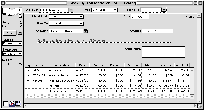 Goldenseal automatically creates checks with a Purchase breakdown when you use the Pay Bills command.