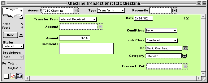 - Choose Checkbook Transactions from the Bank menu, then choose the account into which the interest is credited.