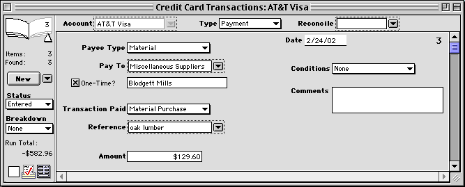 HINT-- To enter a purchase directly into the checkbook or to use a check to pay for more than one transaction, use a breakdown.