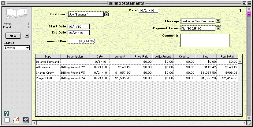 A Billing Statement gives a summary of all billing items, for one Customer account. It combines all unpaid bills-- for sales, rentals, projects, change orders and allowances. It also shows a summary of past balances and payments. HINT-- Each Billing Statement stores a summary of Accounts Receivable for one customer, in the Goldenseal accounting software. WEBSITE INFO LINKS RELATED TOPICS When to Use Billing Statements Use Billing Statements to send a summary of all invoices, to a customer. It shows current invoices, and any overdue items. HINT- Many people send both invoices (from Billing Records) and a Billing Statement summary. Entering Billing Statements To create a Billing Statement, follow these steps: