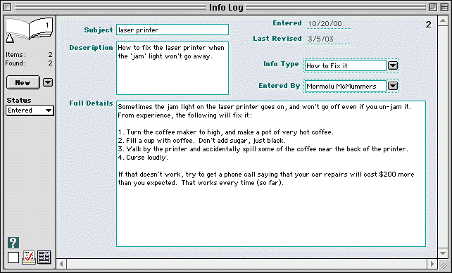 business management software. Simply type in the info. Use the Find command to search for key words or for a particular Info Type, so you can locate