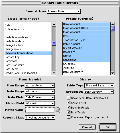 General Area-- Choose the basic type of information to show in the table rows. You can show any type of account, list