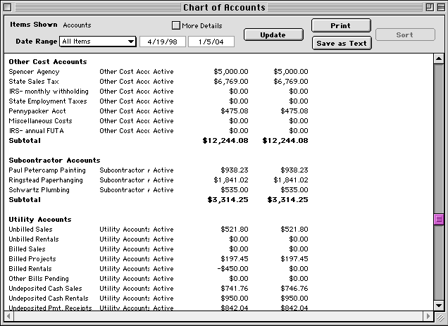 Use the Chart of Accounts report to see a list of all your financial accounts. That includes income accounts (customers and projects), cost accounts (employees, material suppliers and subcontractors) and utility accounts (which handle "intangible" financial amounts such as accounts payable, accounts receivable and unpaid payroll taxes. When you click the Update button, it will show you a list of accounts and account balances, grouped by account type.