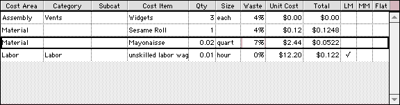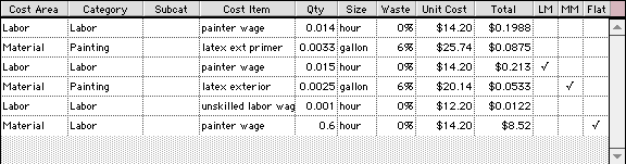 - Line 3 covers painter time for the top coat painting. This cost has a checkmark in the LM column, which means it is multiplied by the labor