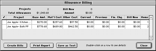 2. To bill for the allowances on a project, double-click on its row.