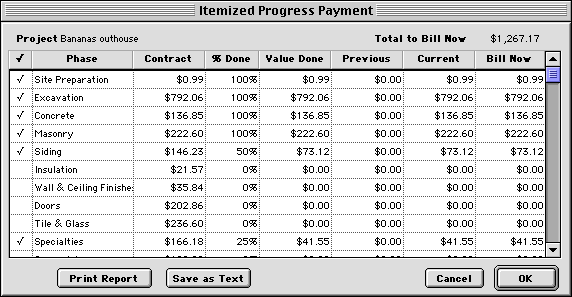5. Click in the first column to bill for a category that has been partially or completely finished.