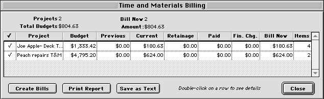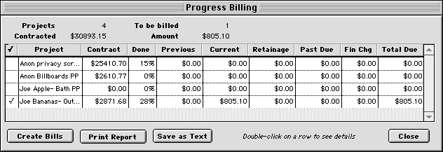 each. Click in the first column to determine which projects to bill now.