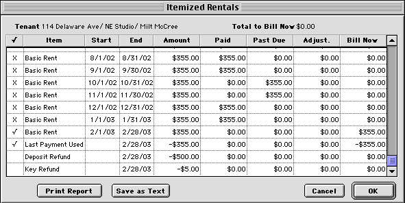 4. You"ll see a list of all payments and credits over the entire rental term. Items that have already been billed are marked with an x in the first column.