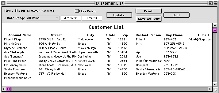 Use the Chart of Accounts report to see your customers in a compact form. When you click the Update button you'll see all of your customer accounts, with address and contact info.