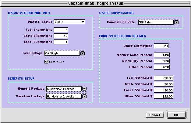 To calculate payroll tax withholding for employees, click the Payroll Setup button, and enter the following