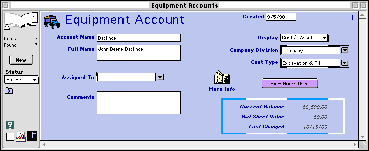 Created-- This is the date that the equipment account was set up. Today's date is entered automatically.
