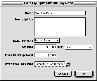 Enter the following information for each Equipment Billing Rate: Name-- Type in a brief name for this billing rate. This is the text that will appear in clairvoyant fields. Assign Equipment Billing Rates in each Equipment account. The Billing Rate field determines what is charged when the equipment item is used for time and materials billing. The Job Cost Rate field determines the internal charge for use of this equipment when it is used on projects. If the selected billing rate uses a Variable Rate calculation method, you can enter the specific billing rate that is used for that equipment account. When you create an Equipment Hours transaction, the rates from the equipment account are entered automatically. You can change either of the billing rates, if a different rate will be used for this transaction.