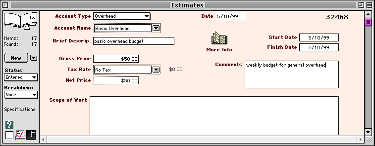 Enter the following information for each Estimate: Account Type-- Enter the type of account to use for the estimate. For an estimate given to a possible customer, choose Prospect. For work that