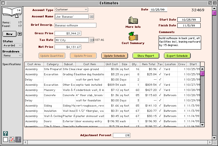 - Click the Update Schedule button. Goldenseal will automatically compute the start date for each item in the estimate.