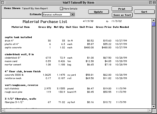 Takeoff By Item/Bill of Materials by Task report that shows all materials, grouped by line items from the