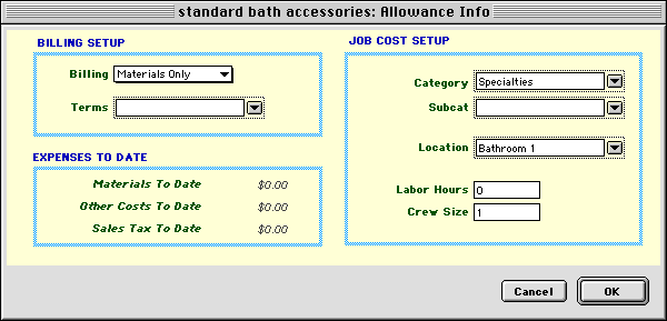 Goldenseal 'posts' the expense to the allowance-- you can see totals in the calculated fields labeled Materials to Date and Other Costs to date. NOTE-- Those fields show the expense amount, without including adjustments or sales tax. Goldenseal posts the sales tax separately so it can be used for billing. If you'd like to see it, use the Custom Layout command and add the Sales Tax To Date field to the layout. Allowance BillingThe estimate will include the allowance price. You'll bill for the basic allowance amount as part of the main project, using either draw schedule, progress payment or time and materials billing.When an Allowance item has been completed, use Allowance billing to bill for the difference between the original budget amount and the actual costs for the item. To do that, choose Billing from the Bank menu, and choose Allowances from the submenu. NOTE-- If you use time and materials billing for the main project, you don't need to bill separately for the allowances, since their cost is already included in the regular project costs. When you use an allowance on a project that uses draw schedule or progress payment billing, Goldenseal only bills for the difference between the total cost of the allowance and the estimate cost, since the original allowance cost is included in the basic billing for the main project. Working With Allowance Records WORKING WITH ALLOWANCE