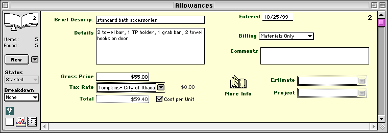 Enter the following information for each Allowance: Brief Description-- Enter a short description of the allowance. This text will appear in estimates that include this allowance. Date Entered-- Today's date is entered automatically. NOTE-- You can't assign an allowance directly to a project. It always needs to be part of an Estimate. Breakdowns To make a detailed breakdown of items included in an allowance, click on the breakdown popup field and enter Category or Items. Goldenseal will show a layout with an allowance breakdown, where you can enter detailed line items to calculate the cost of the allowance, and list any assemblies, labor or material it may need. More Info Click the More Info button to enter the following details about an estimating allowance: Billing-- Choose the type of billing to use for this allowance. HINT-- Goldenseal uses the Labor Hours and Crew Size fields to set up the schedule timing for this item, when it is included in an Estimate. Goldenseal also shows you the expenses to date for this allowance. HINT-- When you enter expenses for an allowance, you'll put the allowance into the Applies To field in the expense transaction.