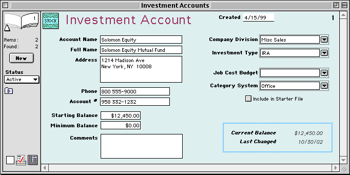 Creation Date-- Enter the date that the investment account was set up. Today's date is entered automatically, but you can change it if