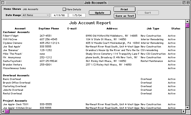 Use the Job Accounts report to see a list of all your job accounts (customers, projects and overhead accounts). When you click the Update button, it will show you a list of accounts, grouped by account type.