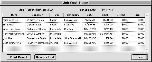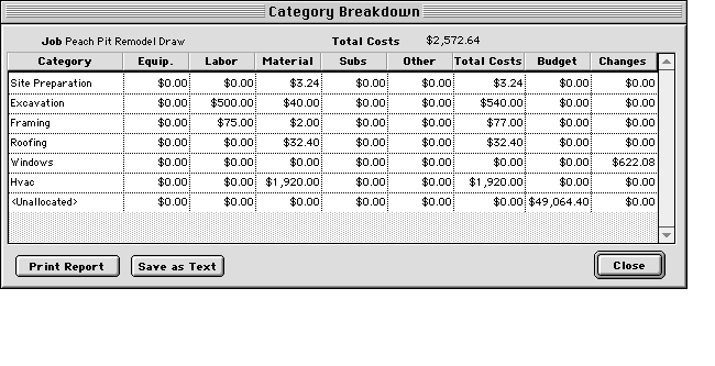 You'll see a list of cost categories, along with the expense amounts posted to each category. HINT-- The breakdown only shows the categories that have a contract amount or an expense amount. If you'd like to include all cost categories in the display, hold down the Shift key when you double-click on the row. If you double-click in the Equipment, Labor, Material, Subs or Other column, you'll only see costs of that type. If you click in the Income column, you'll only see income transactions for the job. If you click in any other column you'll see all costs. To see further details for costs within a category, double-click in its row. If the selected category has subcategories, you'll see a list of its subcategories, with a breakdown for each. If the selected category does not have subcategories, you'll see a breakdown of individual expense transactions. HINT-- To bypass the subcategory display, hold down the Shift key when you double-click on the row. That way you'll see a list of expense transactions for the category. When you are finished viewing the category breakdown, click the Close button, and you will return to the list of jobs. To see a breakdown of specific cost items for a job, follow these steps: