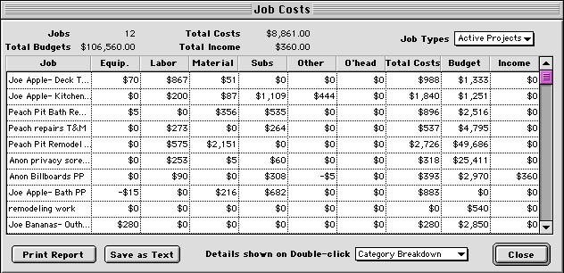 of overhead allocated to the job. NOTE-- The initial Job Costs window shows simple job cost totals which are "posted" to each account and stored there. If you change the calculation method for job costs in Expense Preferences, in some cases the detailed breakdowns may show different totals To view job costs for different types of accounts, click on the Job Types popup at the upper right corner of the Job Costs window. You can view any of the following items: Active Projects-- All Project accounts that currently have Active status. Active Customers-- Totals for job costs assigned directly to all Customer accounts that currently have Active status. Equipment-- Expenses used to maintain equipment, and income that results from equipment use. To see a detailed breakdown of costs by cost category, double-click anywhere in the row of the job you'd like to see.
