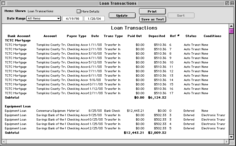 Use the Loan Transactions report to see a list of payments and deposits in your loan accounts. When you click the Update button, it will show you a list of loan transactions, grouped by loan account. HINT-- Use Loan accounts for money that you owe, that isn't a credit card. Loan accounts can include mortgages, equipment loans, lines of credit and any other money that you owe to someone.