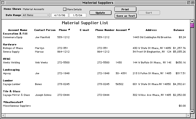 Use the Material Accounts report to see a list of all your material suppliers. When you click the Update button, it will show you a list of suppliers, grouped by cost type.