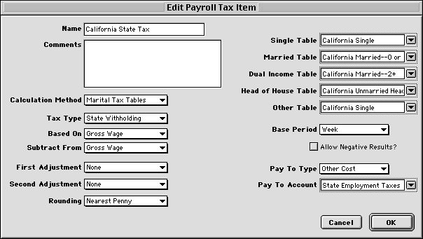 Tax Table-- The tax item uses a Tax Table to calculate the tax amount. Select