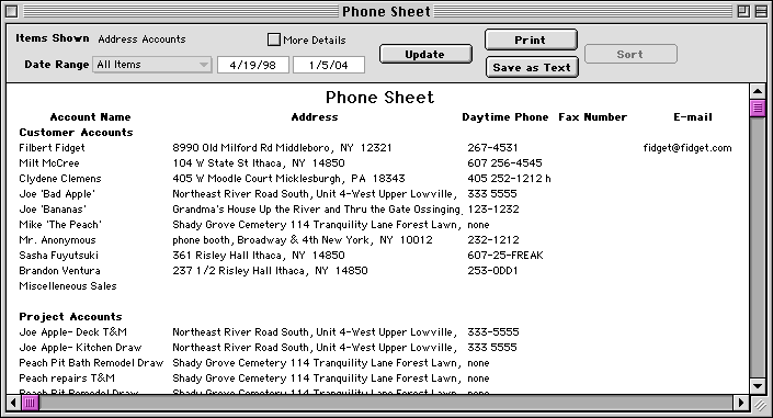 If you would like to convert the phone sheet info to some other format, click the Save as Text button and save the report as a file. You can then open it with a spreadsheet or word processor program, and modify the data or appearance. To change the data that shows in the table, use the Custom Layouts command. For more about using reports, click here. Main Page | Accounts | Lists | Transactions | Menus | Index | Website | User Page |