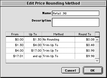 EXAMPLE-- If you enter $.95 into the rounding method table, then $.33 or $.99 will be rounded