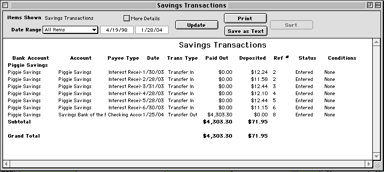 Use the Savings Transactions report to see a list of transactions in your savings accounts. When you click the Update button, it will show you a list of transactions, grouped by savings accounts. HINT-- Use Savings accounts for any bank account that doesn't write sequential checks.