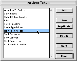When you create a new simple list item, you can change the name in the list without going to a separate dialog. Click Edit to change the name of the selected item. You can also double-click on the item in the list. Examples of Simple Lists These items are all simple lists-- Actions Taken, Appointment Types, Contact Types, Document Types, Info Types, Investment Types, Location Classes, Problem Types, Prospect Sources, Reconcile Periods, Subcontract Types , Tools, Unit Sizes. HINT-- Some versions of Goldenseal small business software may be lacking some of these simple lists.