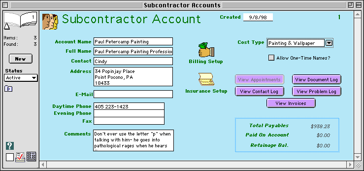Click the Billing Setup button to enter billing and job costing info for this subcontractor: